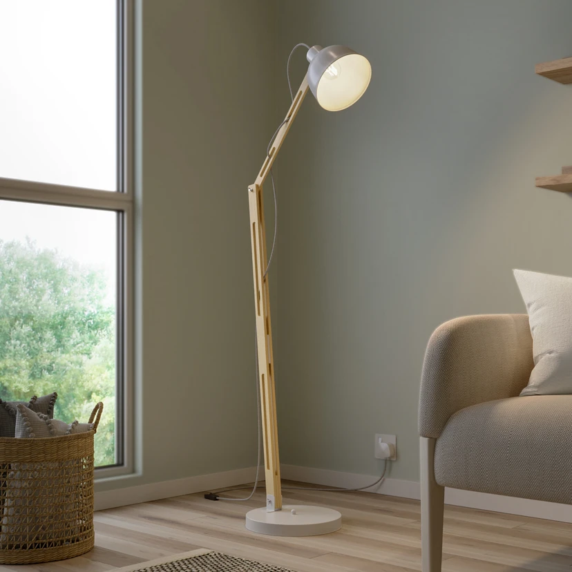 The Skansen floor lamp combines industrial design with an elegant combination of wood and metal. This stylish light fits seamlessly into living rooms and dining rooms, adding a modern touch. The light wood look combined with the white finish creates a harmonious yet striking appearance that gives any room a special touch.
