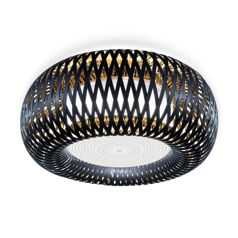 Designer ceiling light Kalatos - wickerwork in a modern interpretation An independent concept from a designer, realised with materials developed in-house, combined with a generous lighting effect - the Kalatos ceiling light combines the typical characteristics of the high-quality lights from the Italian manufacturer Slamp. The creator of the ceiling light, Elisa Giovannoni, was inspired by traditional wickerwork. However, instead of the wood and plant fibres used for wickerwork, Kalatos uses Slamp's technopolymers. The outer woven Ring and the matt white Innes body, whose four internal E27 sockets can be fitted with filament LED bulbs, are made of different plastics. The light is emitted diffusely all round. The matt white diffuser appears particularly bright from below. Kalatos is particularly effective above seating areas and tables in living and dining rooms, but also in restaurants or lobbies.