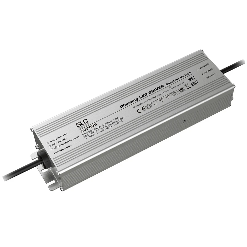 The LED driver from SLC is suitable for LED strips and other products with 24 V operating voltage and a total power of up to 200 W. The driver has a built-in PWM dimmer and can be dimmed externally via the phase section. Can also be used outdoors (IP67 protection).