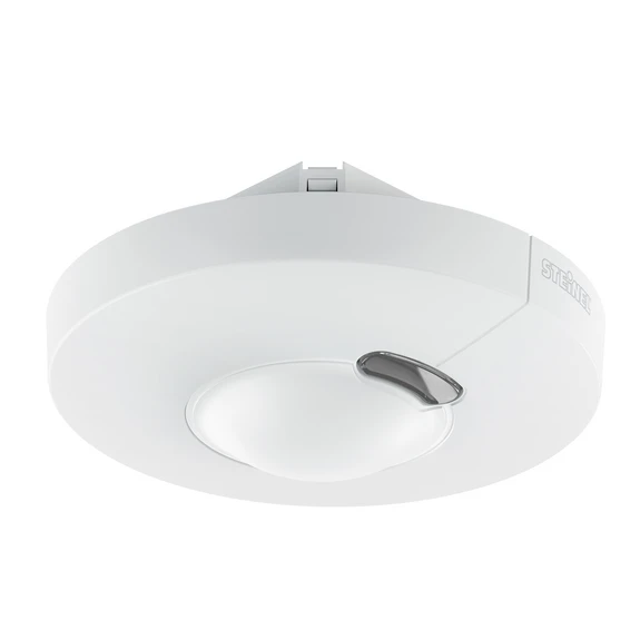 Motion detector HF 3360 round COM1 (switchable) Flush-mounted This HF 3360 high-frequency motion detector is unstoppable. It is ideal for cellar corridors, stairwells, multi-storey car parks and much more and is ideally mounted at a height of 2.80 metres. The sensor detects movements all around at a 360° angle and at a distance of 1 - 8 metres (radial), regardless of temperature thanks to HF sensor technology. It also penetrates glass, wood and lightweight walls. The sensor detects the smallest movements reliably and precisely, ensuring perfect automatic light control - even in stairwells over 2 floors. Round version, switchable (COM1), flush-mounted - 360° detection range for ceiling mounting, 180° for wall mounting - Response brightness adjustable from 1 - 1000 lux - Range 1 - 8 metres - Light duration adjustable from 5 seconds to 15 minutes