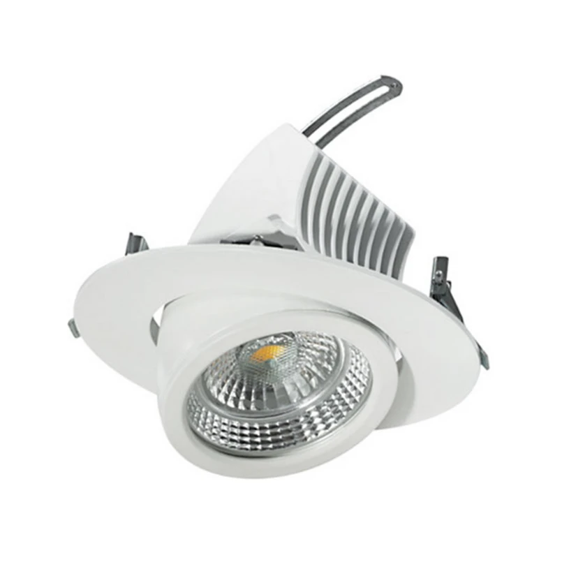 Swivelling LED recessed spotlight, round with LED driver This LED recessed spotlight enables perfect presentation of goods with targeted lighting, as the spotlight can be swivelled. It is made of sheet steel and equipped with an aluminium reflector. Original Philips COB LEDs with a warm white light colour (3,000 K) have been installed in the spotlight.