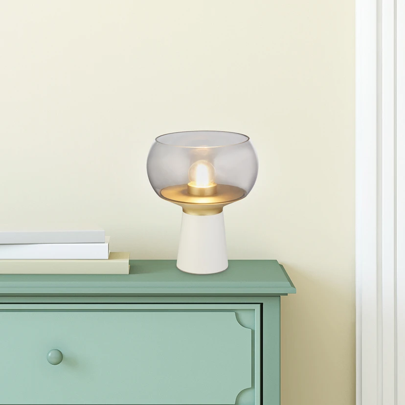 Goblet table lamp made of steel and glass With its elegant base, which is painted white and brass-coloured, the Goblet table lamp impresses with its timeless beauty. Made from a combination of steel and glass, this light exudes durability and style. The smoky grey tinted glass shade adds a touch of sophistication and enhances the look of any room. It can be switched on and off using a switch on the cable. X Goblet has space for an E27 bulb (not included, see accessories).