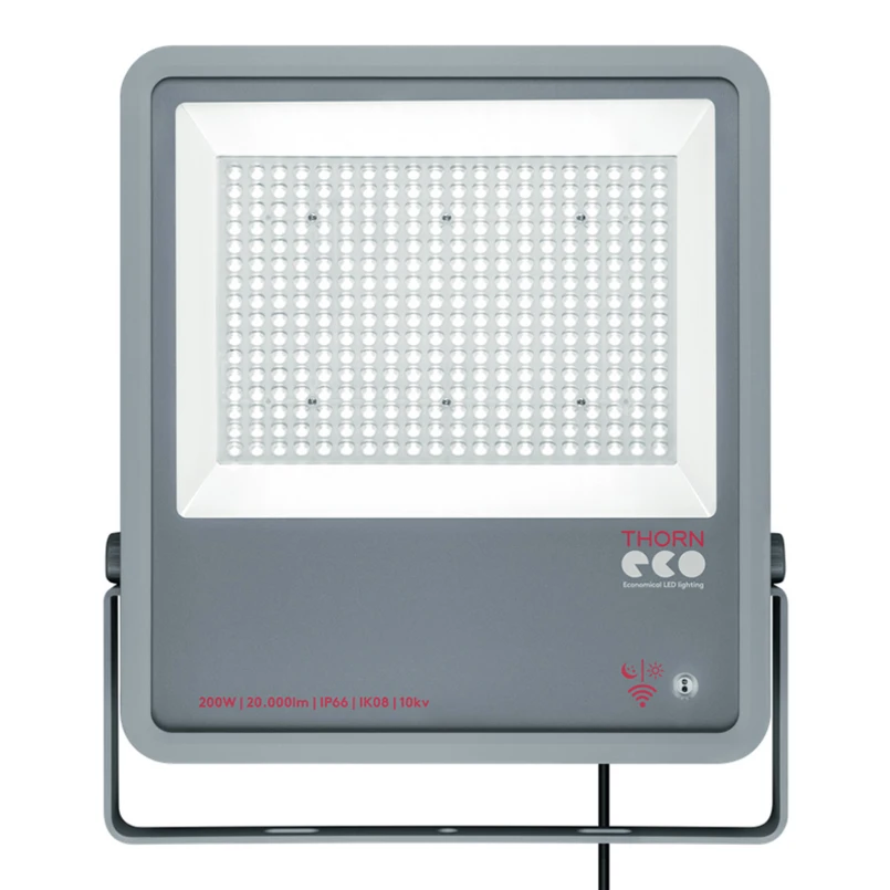 High-performance LED outdoor spotlight LEO in a compact design, 200 W A high light output, asymmetrical light emission and resistance make the LED floodlight LEO the ideal choice for illuminating walkways, facades or business premises. The flat, angular LED floodlight with its die-cast aluminium housing painted in 9006 (white aluminium) is fitted with a hardened Glasabdeckung and a PC lens. A membrane in the floodlight ensures automatic temperature control of the floodlight. Pre-wired with 3 m mains cable - Integrated photocell for automatic control based on ambient brightness - Particularly weather-resistant with IP code IP66 - Impact resistance index IK 08 - Chromaticity tolerance (initial MacAdam): 5 - Power factor 0.9 - Average rated service life 50000 h L70 at 25 °C - Ambient temperature: - 20 to + 50 °C