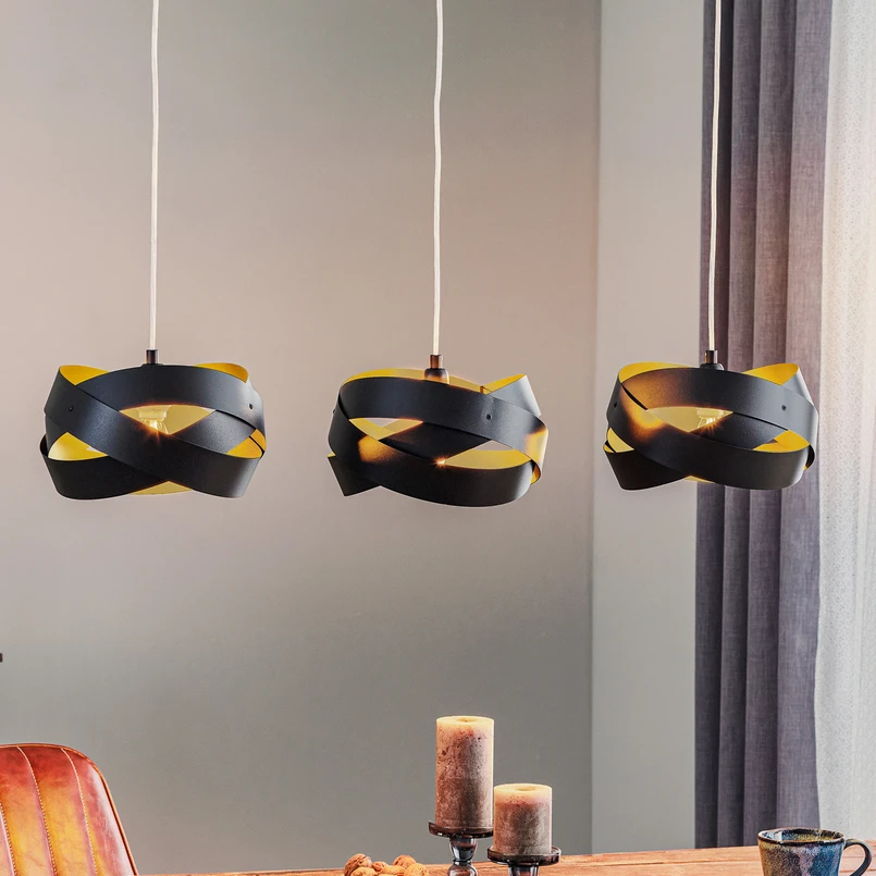 To illuminate a dining table or a counter of modern furnished rooms, the three-lamp pendant lamp Tornado is perfectly suitable. Its shades, each made of three overlapping metal strips, let the light escape directly upwards and downwards, but a part also falls through the spaces between the individual metal strips and creates unique lighting effects in the room. Due to the matt black colour, the pendant lamp becomes a striking light object above any table.