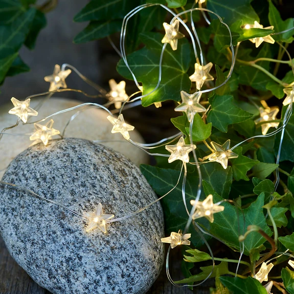 Trille star fairy lights with LED lighting - 40-piece There are numerous ways to use these beautiful LED fairy lights throughout the interior. It decorates a table just as decoratively as a windowsill or a glass jar. Das battery compartment is transparent and therefore barely visible. It is fitted with two AA batteries. Batteries are available from the accessories. The cable is also inconspicuously transparent.