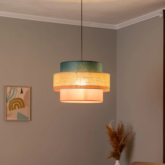 Cosy Trio pendant light with three-layer jute textile lampshade The Trio pendant light features an appealing fabric shade consisting of three cylindrical spheres in petrol, natural brown and orange. The suspension with round canopy is in black.