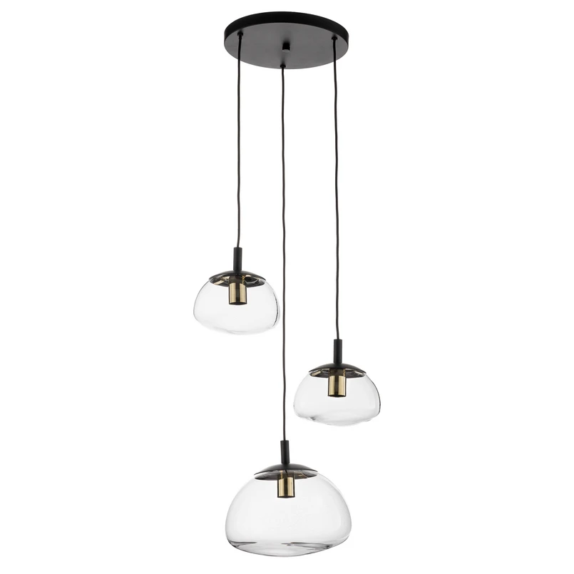 The Turku 3-bulb round clear/black pendant lamp combines modern design with high-quality materials. Made of steel and glass, it fits seamlessly into various room concepts, whether in the living room, kitchen or dining room. The clear and black colour scheme, complemented by brass accents, gives the lamp a timeless elegance that enhances any room.