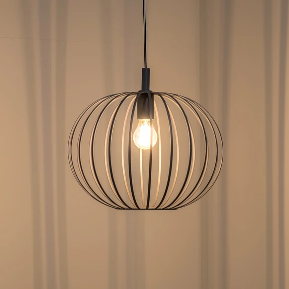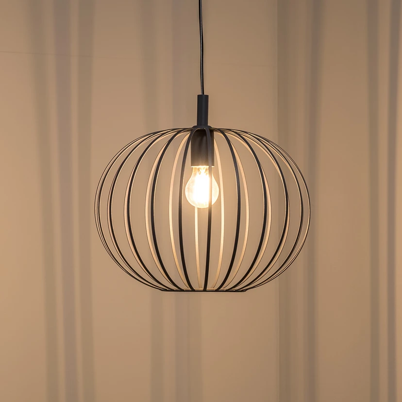 Valor pendant light with oval cage shade in anthracite Made of steel, the Valor pendant light in anthracite is equipped with a round canopy, a downward-facing E27 socket and an oval-shaped cage shade consisting of slender struts. The hanging light can be ideally complemented with a decorative filament bulb and harmonises particularly well with modern furnishing concepts. It is produced in Europe.