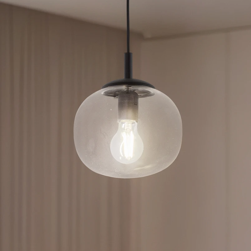 Vibe glass pendant light with round lampshade in a clear finish The Vibe pendant light is particularly impressive in modern furnishing concepts. It combines black elements with an almost spherical glass shade. The clear material allows a view of the inside, so that a decorative E27 bulb is perfectly accentuated.