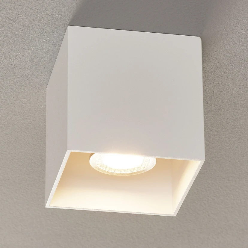 Box ceiling light for illuminating accents A pretty cube with a modern colour and shape design sets accents - this is how the effect of the Box ceiling light can be described in one sentence. Whether used individually to set the scene in a particular area or in rows, for example to illuminate a corridor or staircase, Box fits ideally into many modern lighting concepts. Equipped with a GU10 socket: all types of bulbs - including economical LED bulbs - with a GU10 base can be used.