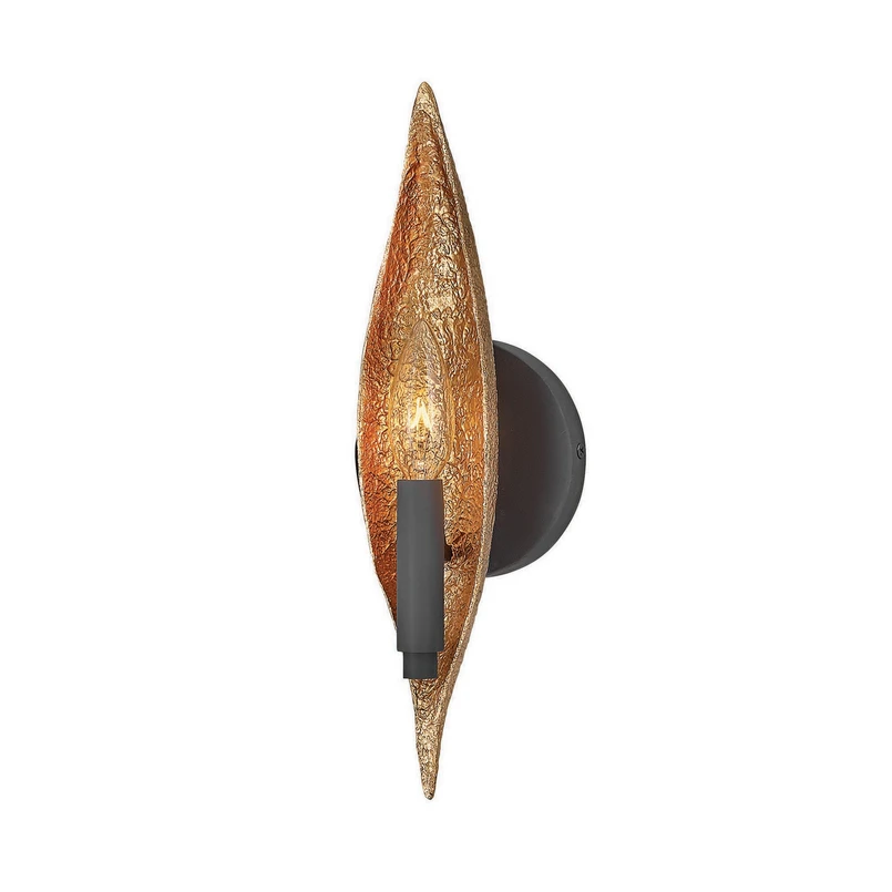 Willow wall light in black and gold The Willow wall light with black socket and black, round wall mount is fitted with a long, organically shaped, golden lampshade with a fine structure that shields the bulb on one side. This creates a warm and cosy lighting effect. The wall light is the perfect complement to the pendant lights in the series and provides a decorative additional light source for living or dining rooms.