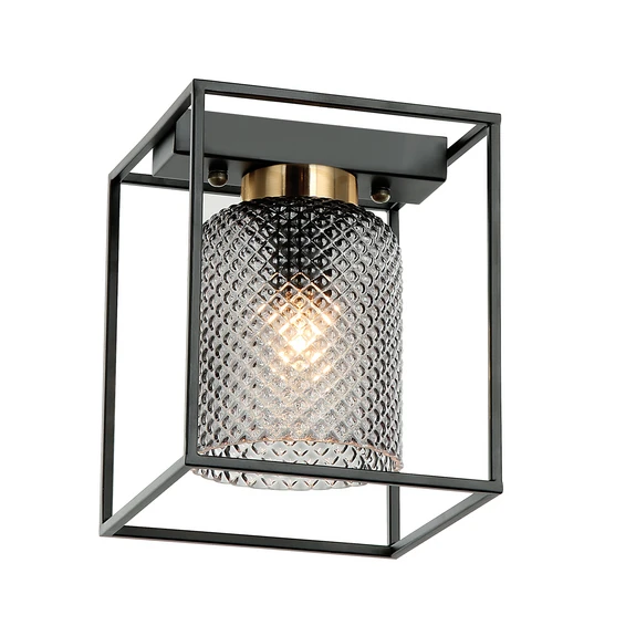 Zac ceiling light with glass shade in a steel cage The Zac ceiling light combines round shapes (cylinders) with angular ones (cuboids). The mix of materials also promises contrasts: smoky grey glass and black steel. The inner lampshade of the ceiling light is made of textured glass, which allows the bulb to be seen in silhouette. On the outside, the glass cylinder is framed by a black steel frame in cuboid form, hinting at the modern cage look.